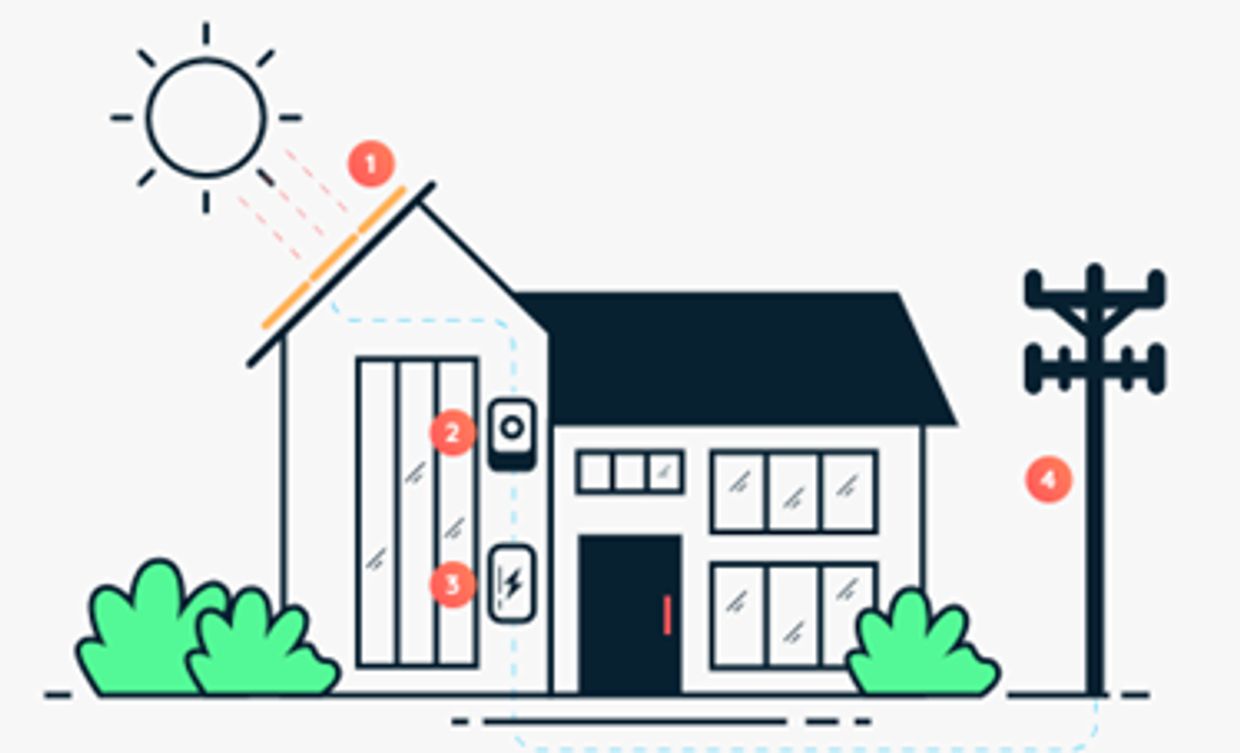 Solar system which includes batteries for backup power. Here, kilowatt hours (kWhs) generated from your solar system are stored in large battery banks. What makes this setup so unique is that you act like an island and are completely removed from the grid.